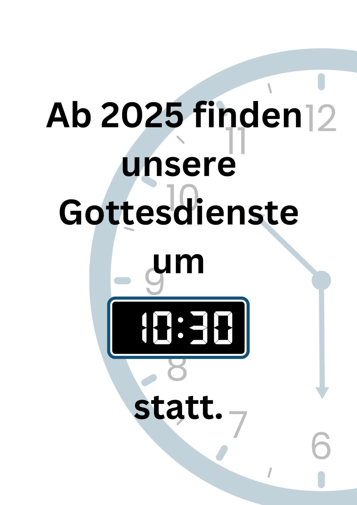 Neue Gottesdienstzeit ... ... Ab Januar 2025 finden die regulären Gottesdienste immer um 10.30 h statt! alle aktuellen Meldungen